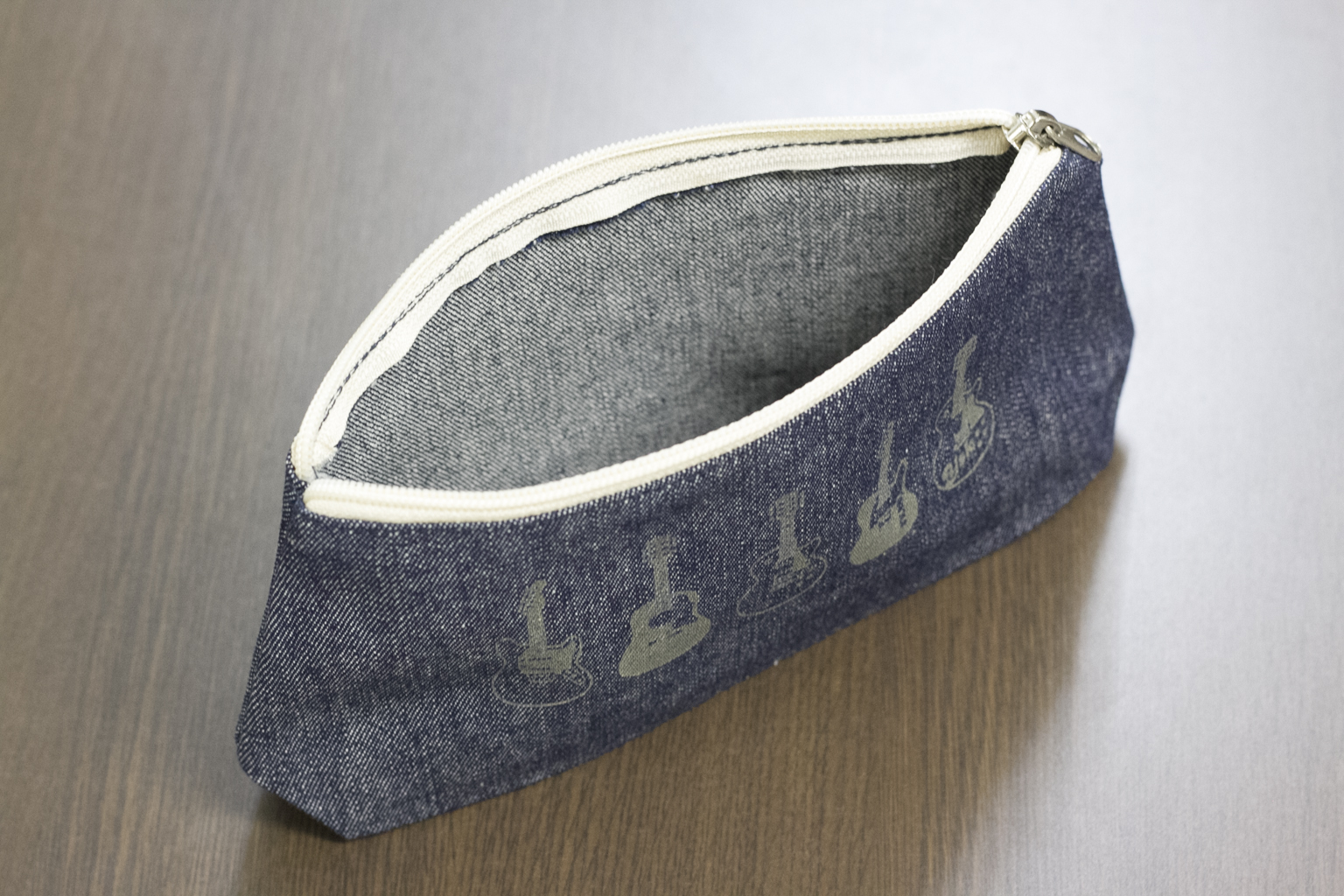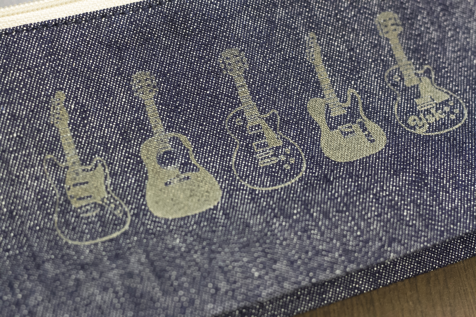 デニム地のポーチに、ギターが並べて刻印されています。